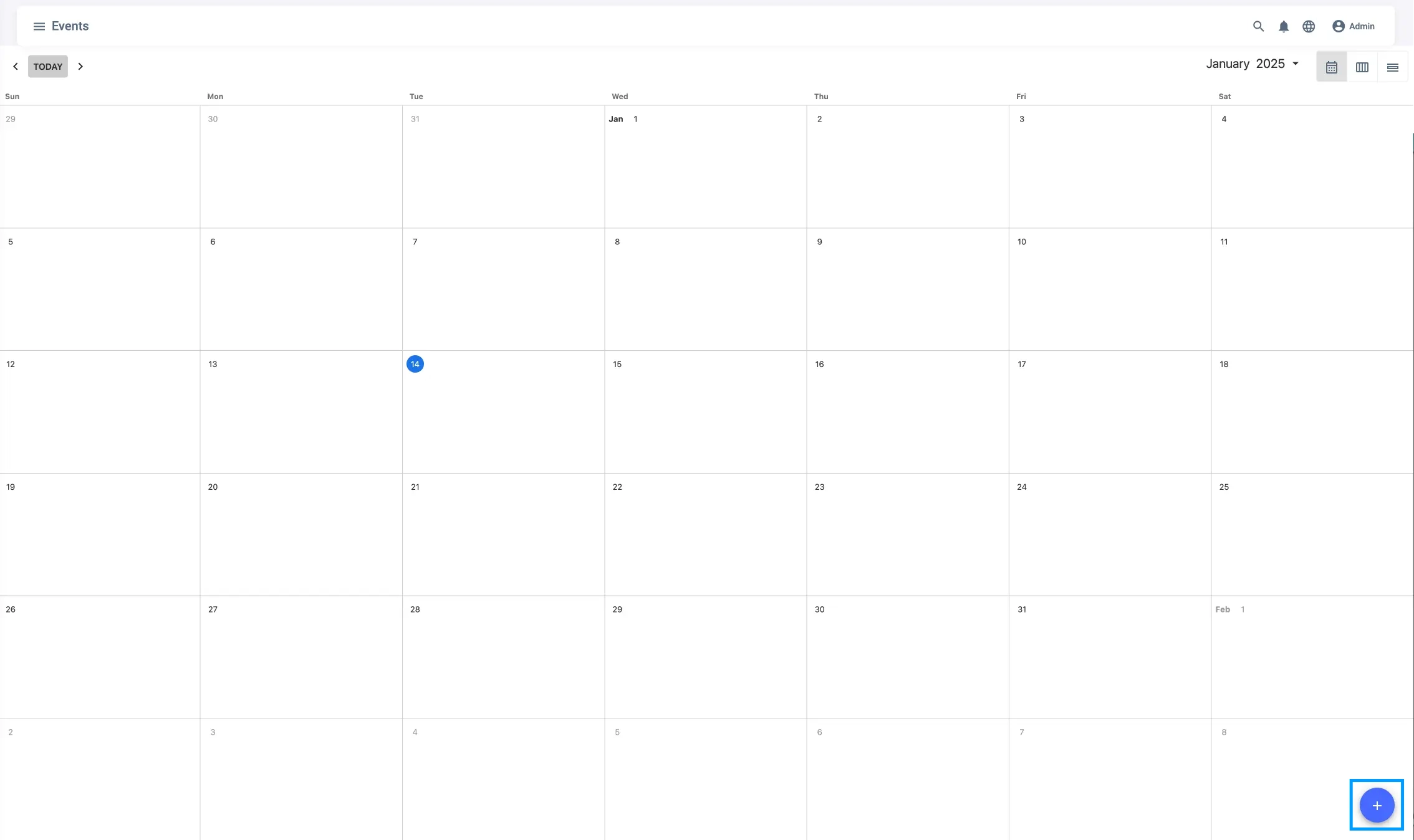 Being on the Calendar View, click on the ”+” button located at the bottom right corner of the screen. This will open the “Add Event” view, where you can fill in the details of the event you want to create.