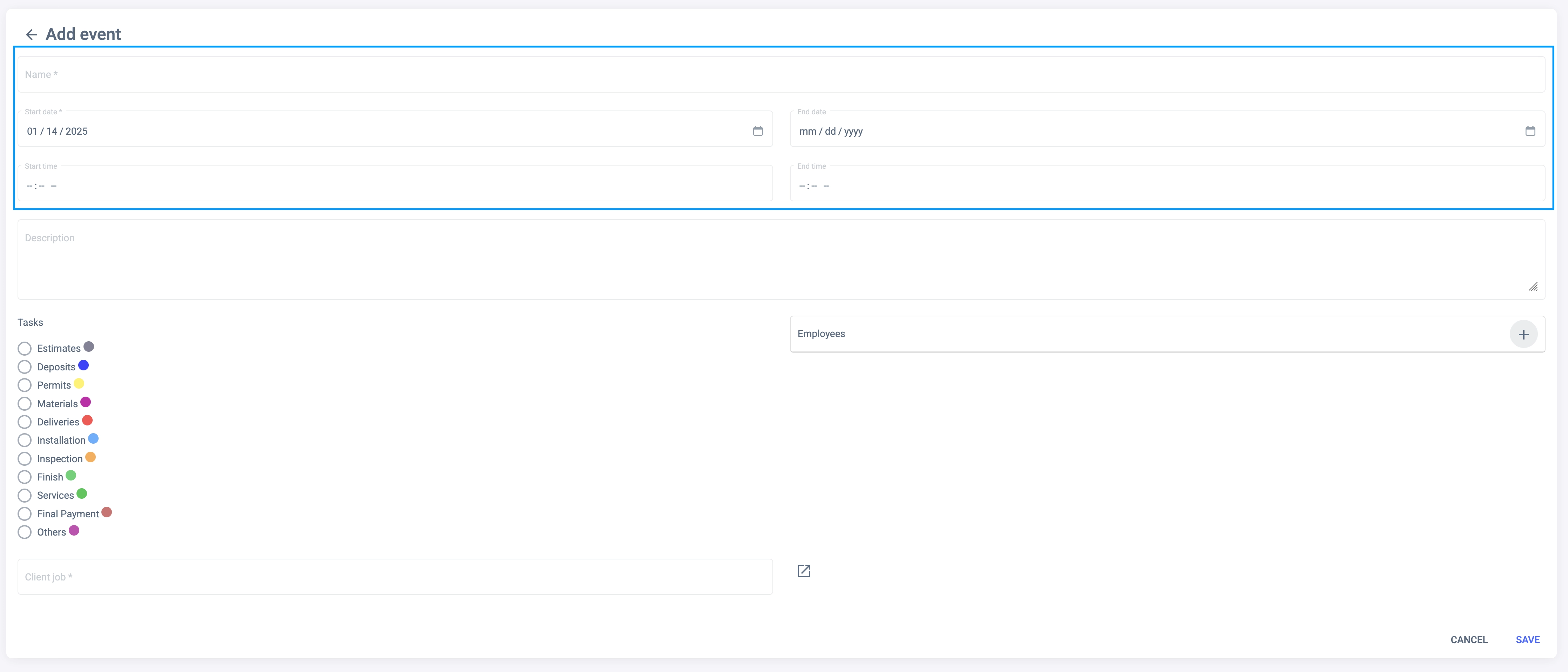 The first fields to fill in are the name of the event, the date, and the time. Name and Start Date are required fields, while the end date and time are optional.