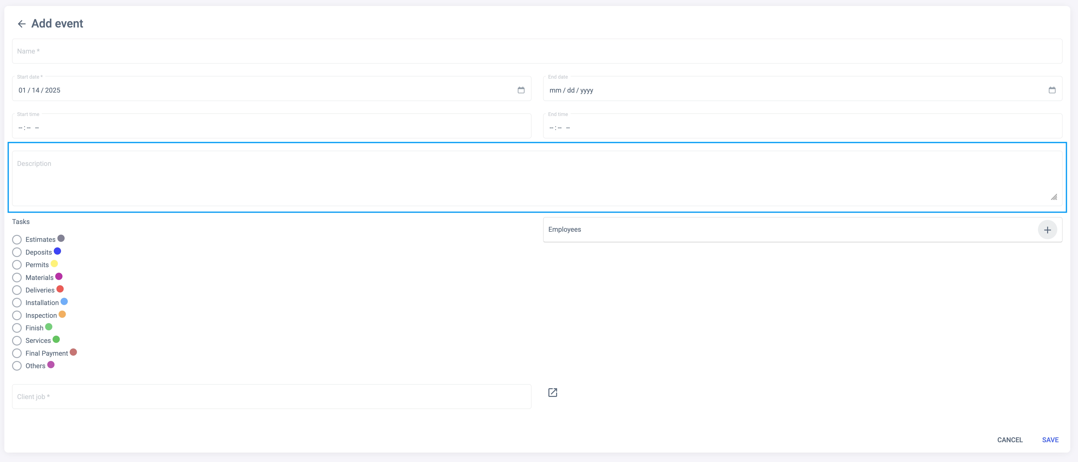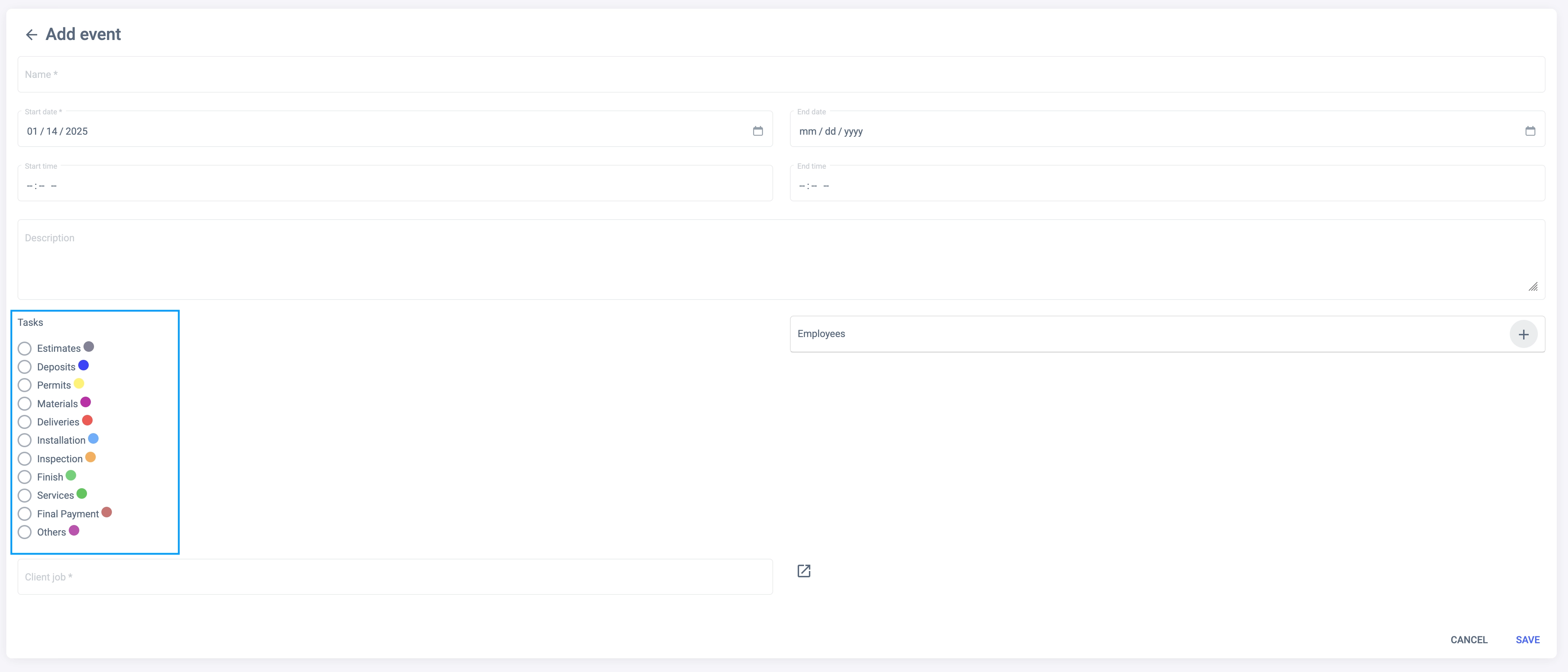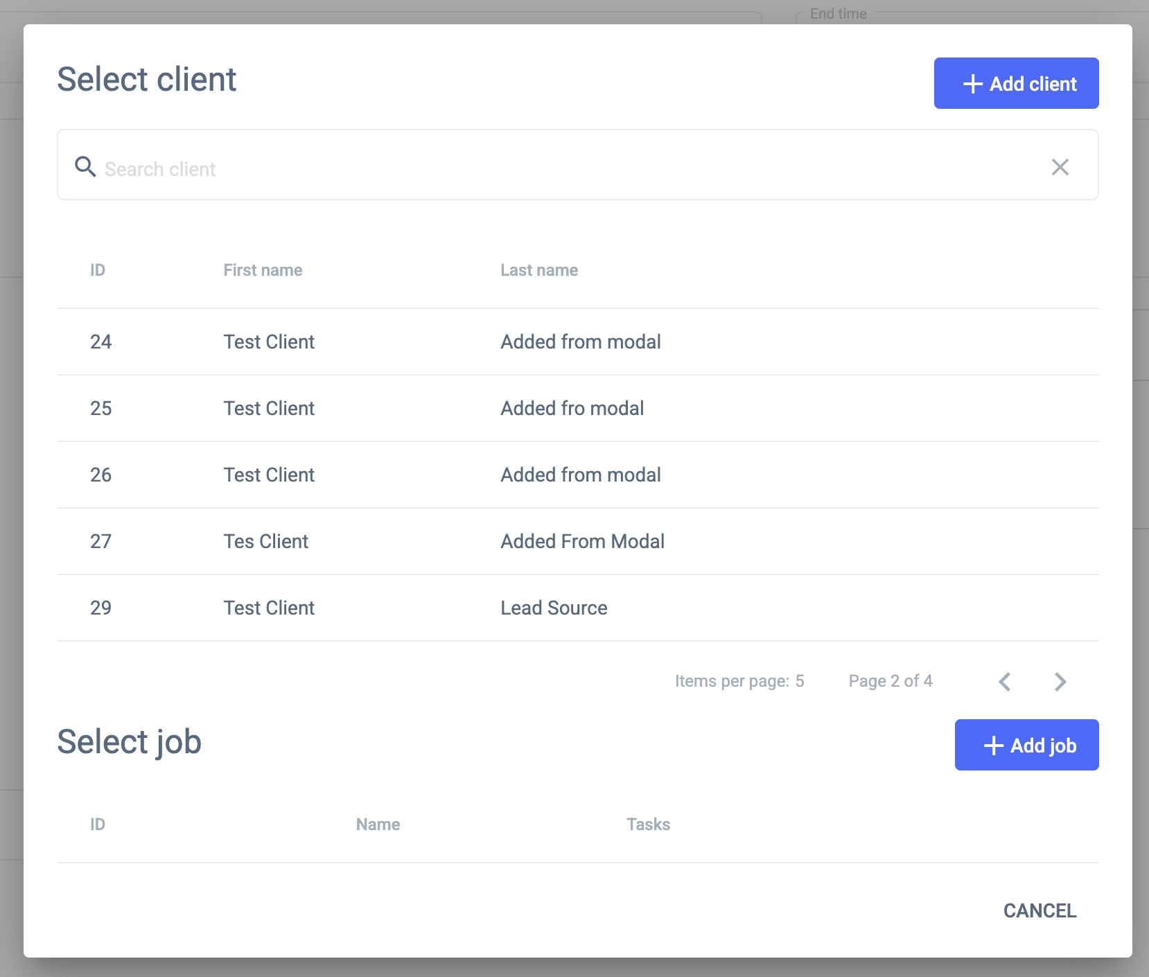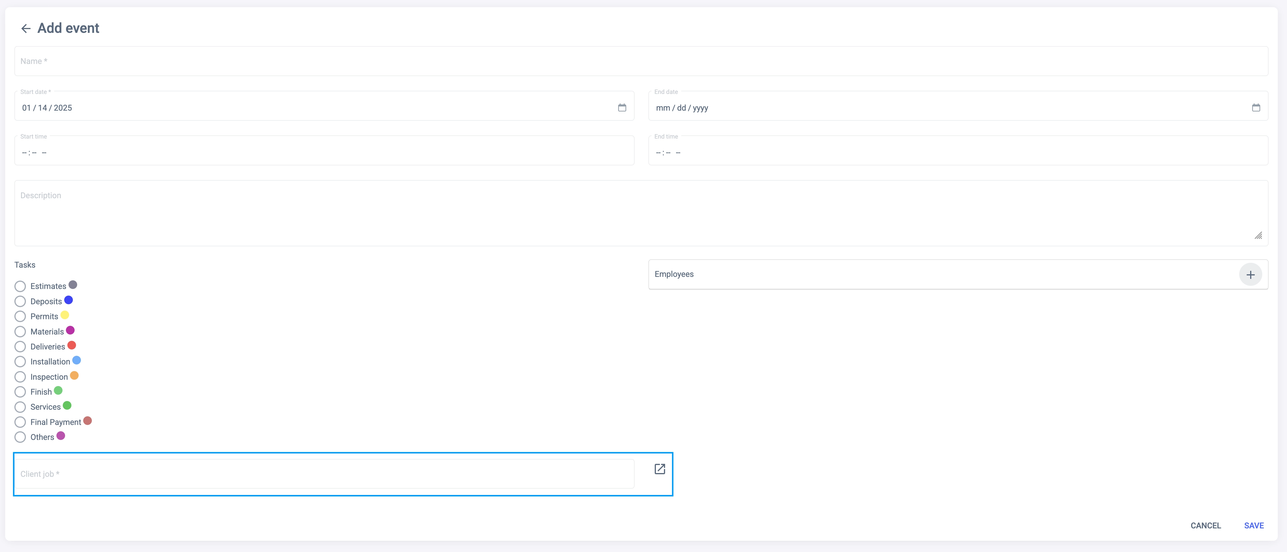 This will open a modal window where you will select the Client and the Job this event will be associated with.