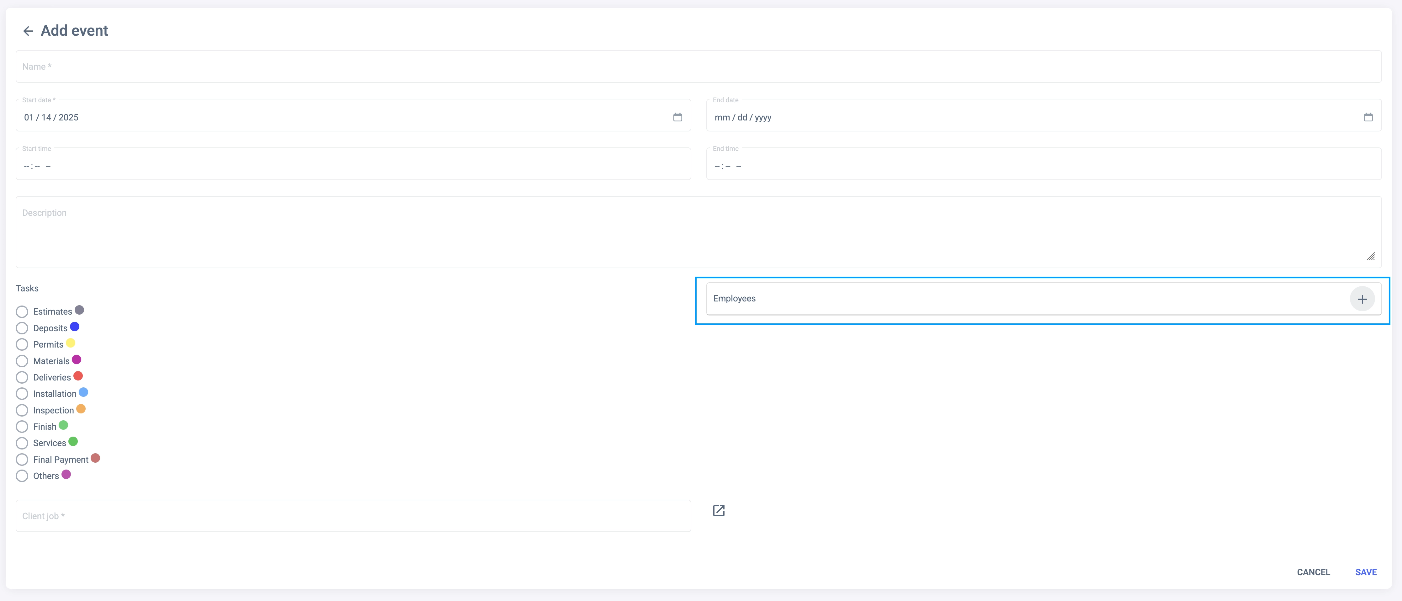 You can assign the event to one or more employees. At least one employee must be assigned to an event, but you can add ass many employees as you want. This is useful to notify the employees involved in the event.