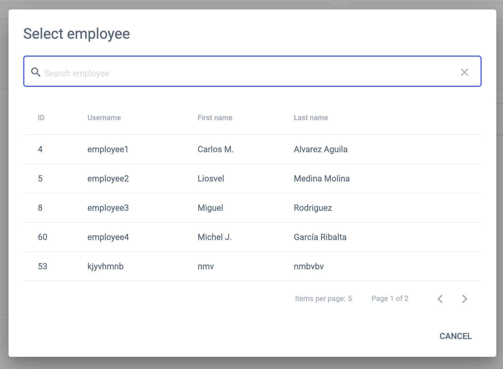 By clicking on the ”+” button will open a modal window where you will be able to select One Employee At a Time. Employee Searching is also available.