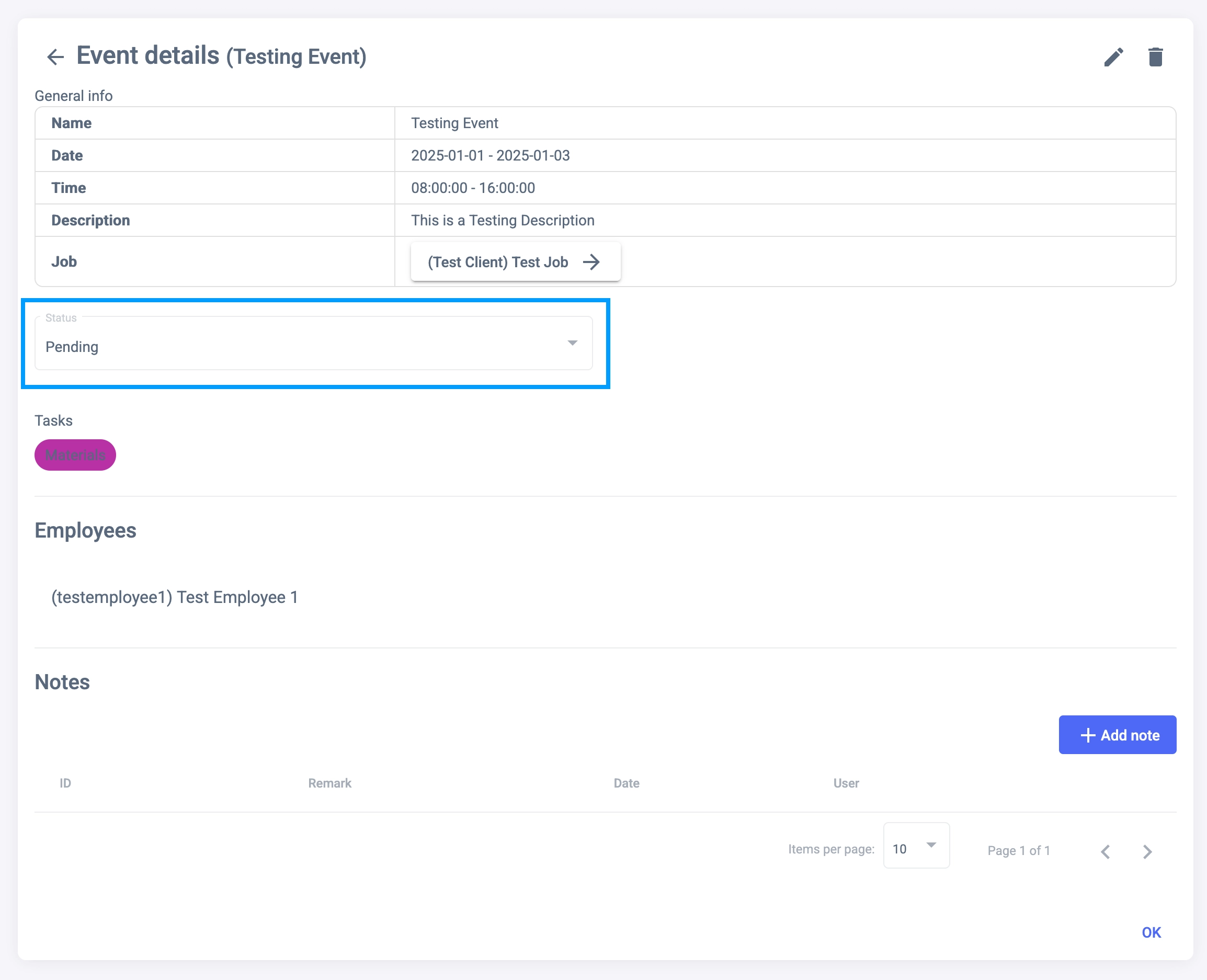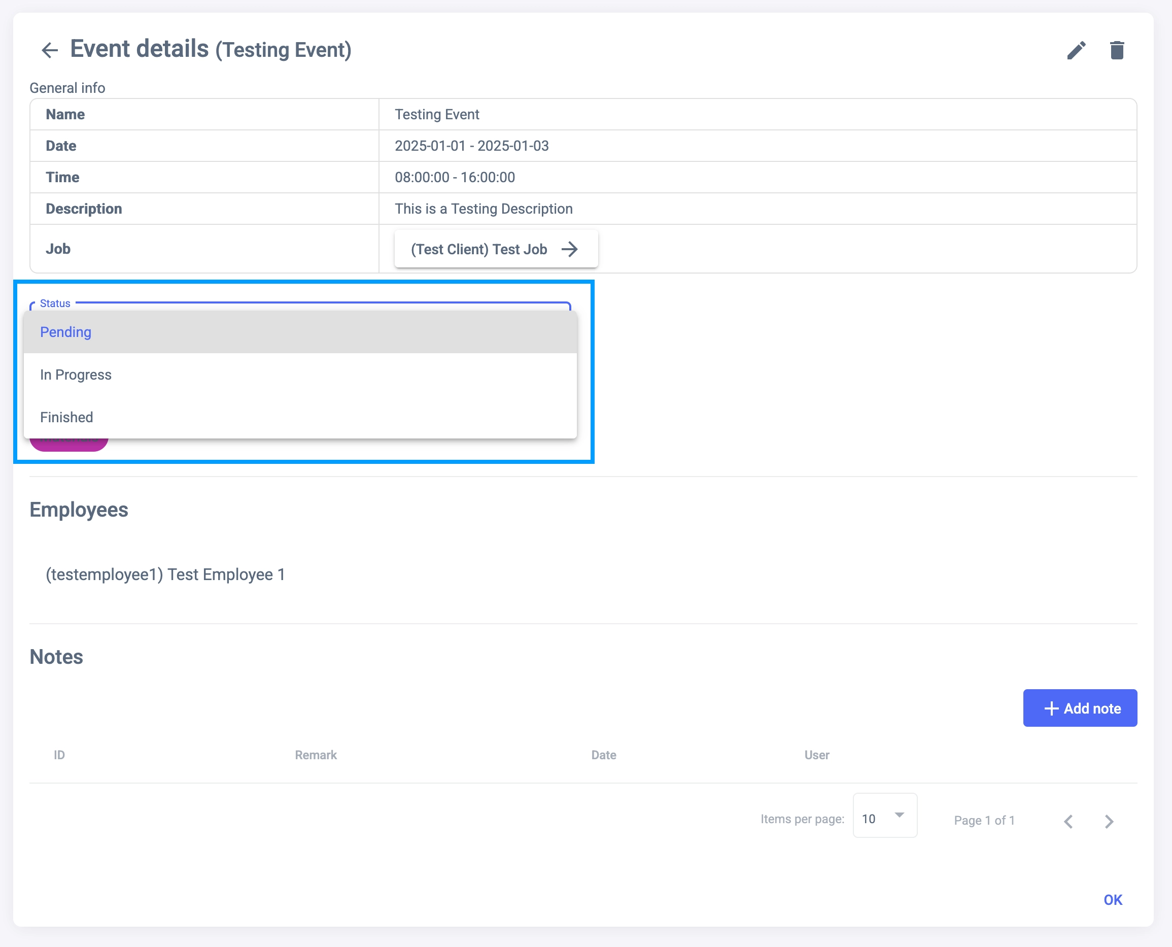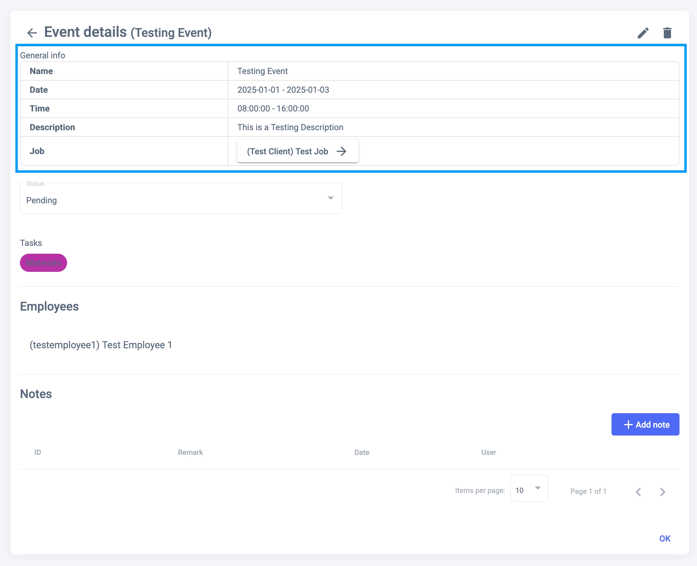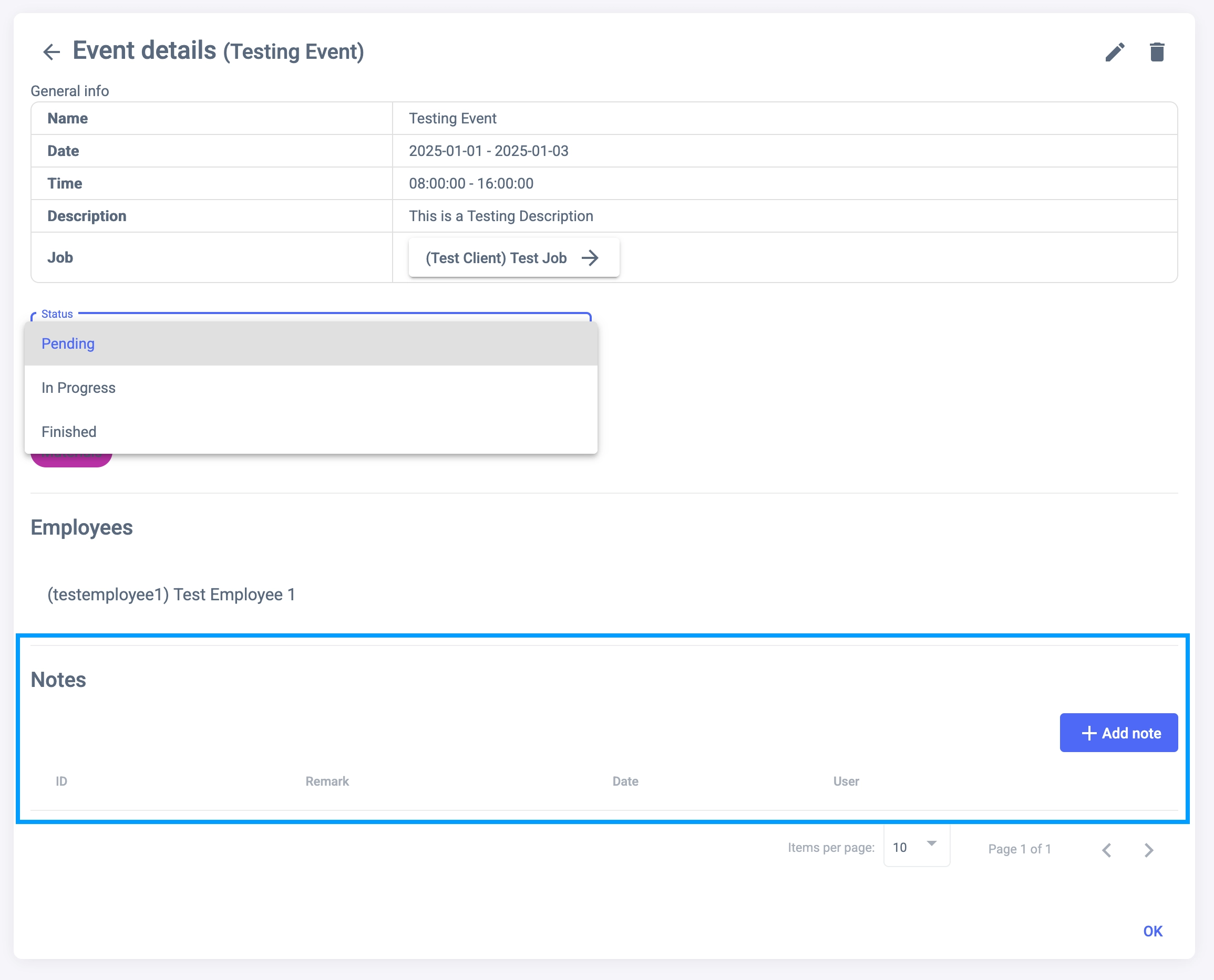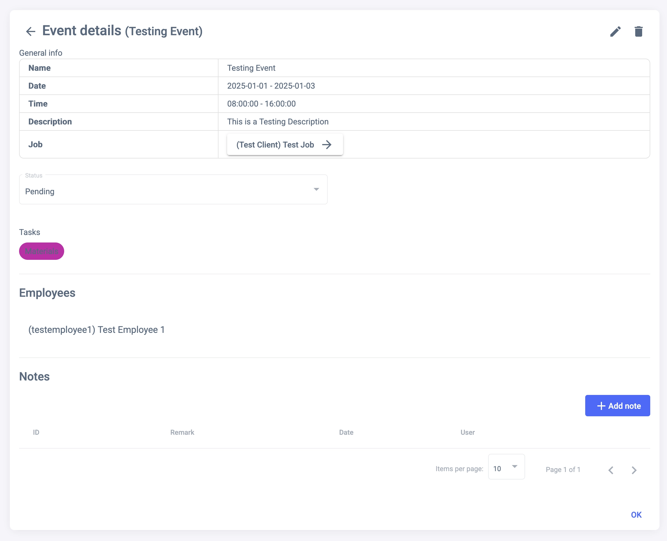 After Clicking an event in the calendar, you will be taken to the event details page. Here you can see the details of the event, add notes, and attach files.