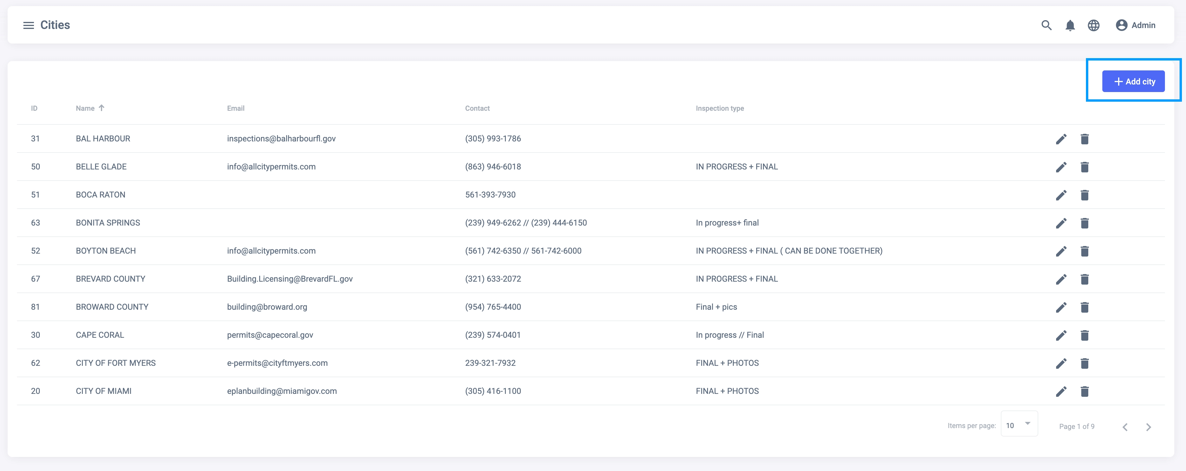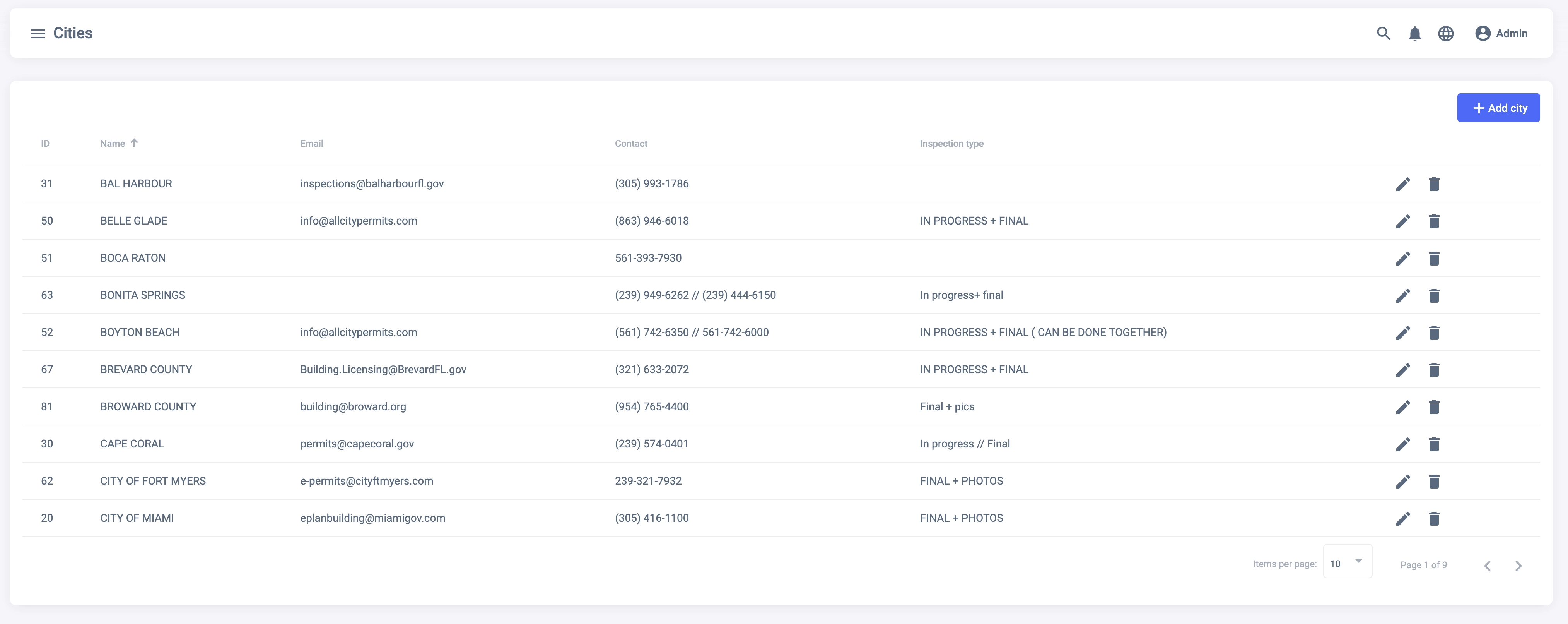 Cities are entities created to group contacts and specific guidelines for Home Inspection. Every city has their own guidelines respecting the home inspection. Every city has their own contact information.