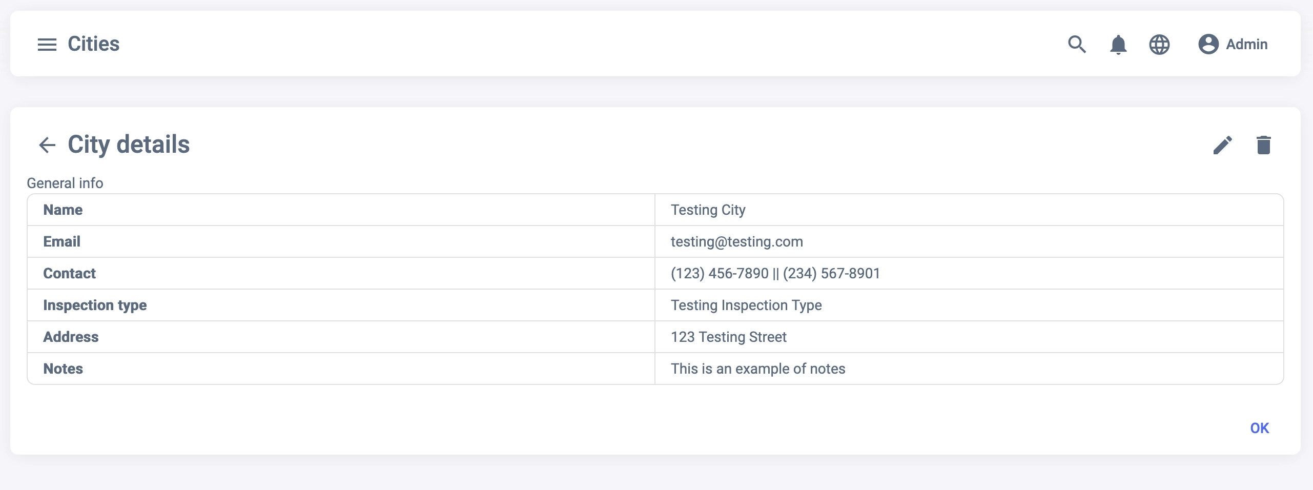 Edit and delete options are available on the top right corner of City Details Tab. Depending on your role, you will see these buttons enabled or diabled. If you want to edit or delete a city but you can’t due to your role, please contact to a Manager or Administrator.