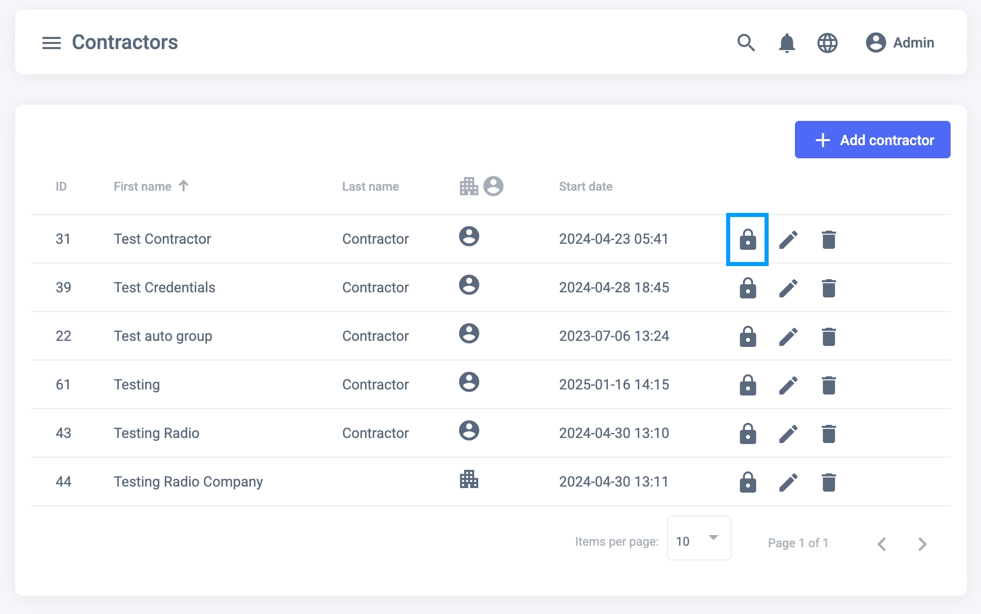 In Contractors Tab, click on the “lock” icon in the Contractor’s row you want to change the password.