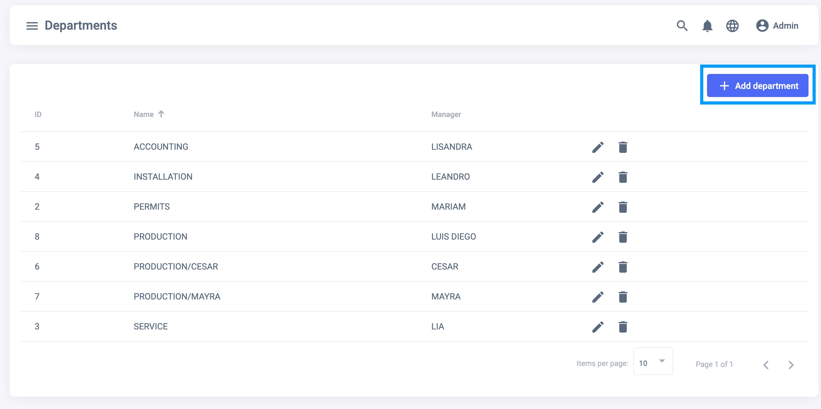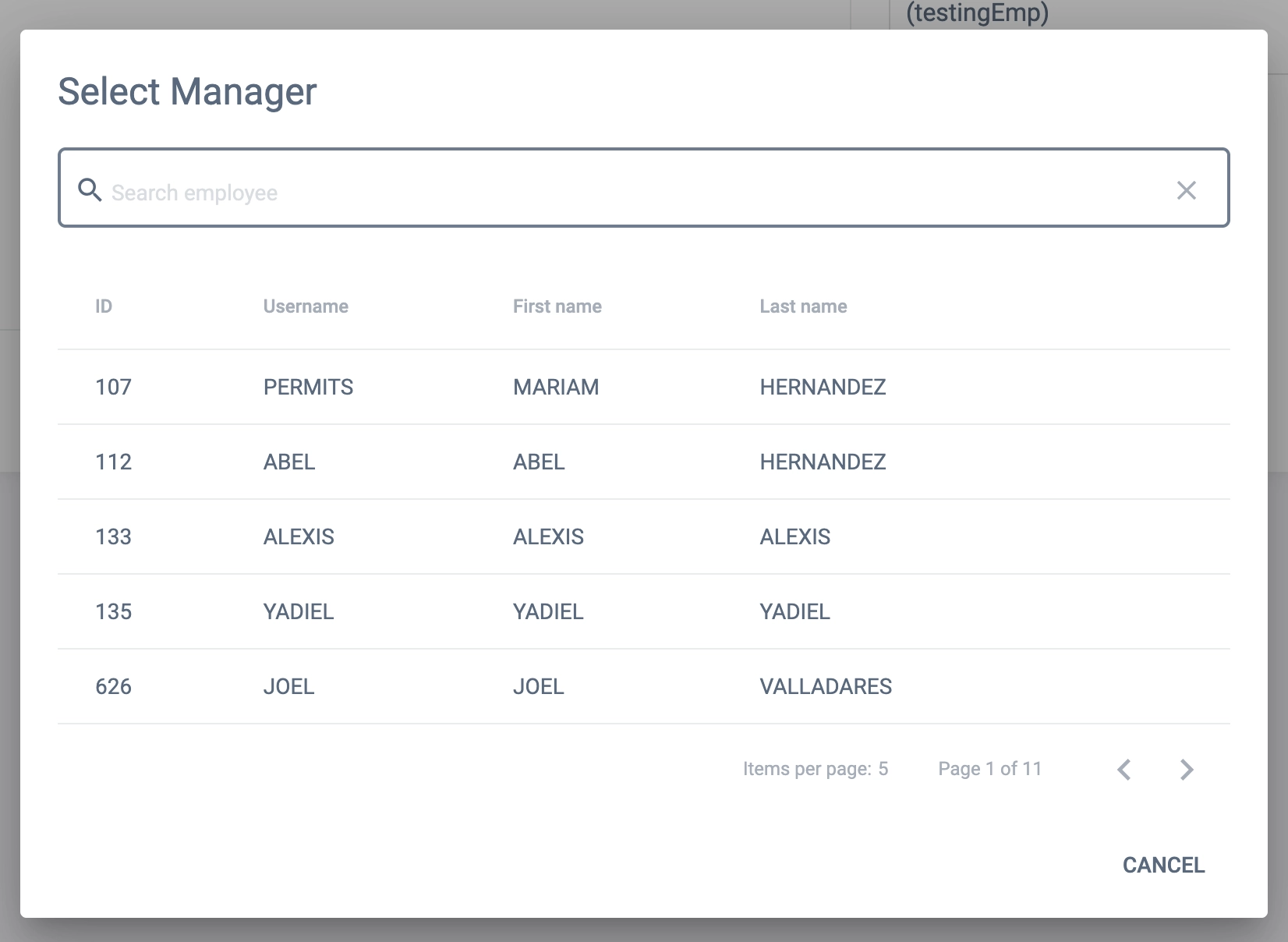 After setup the name and description of the Department, you can setup the manager. For do this, click on the Manager Field and you will open a modal to select the Manager.